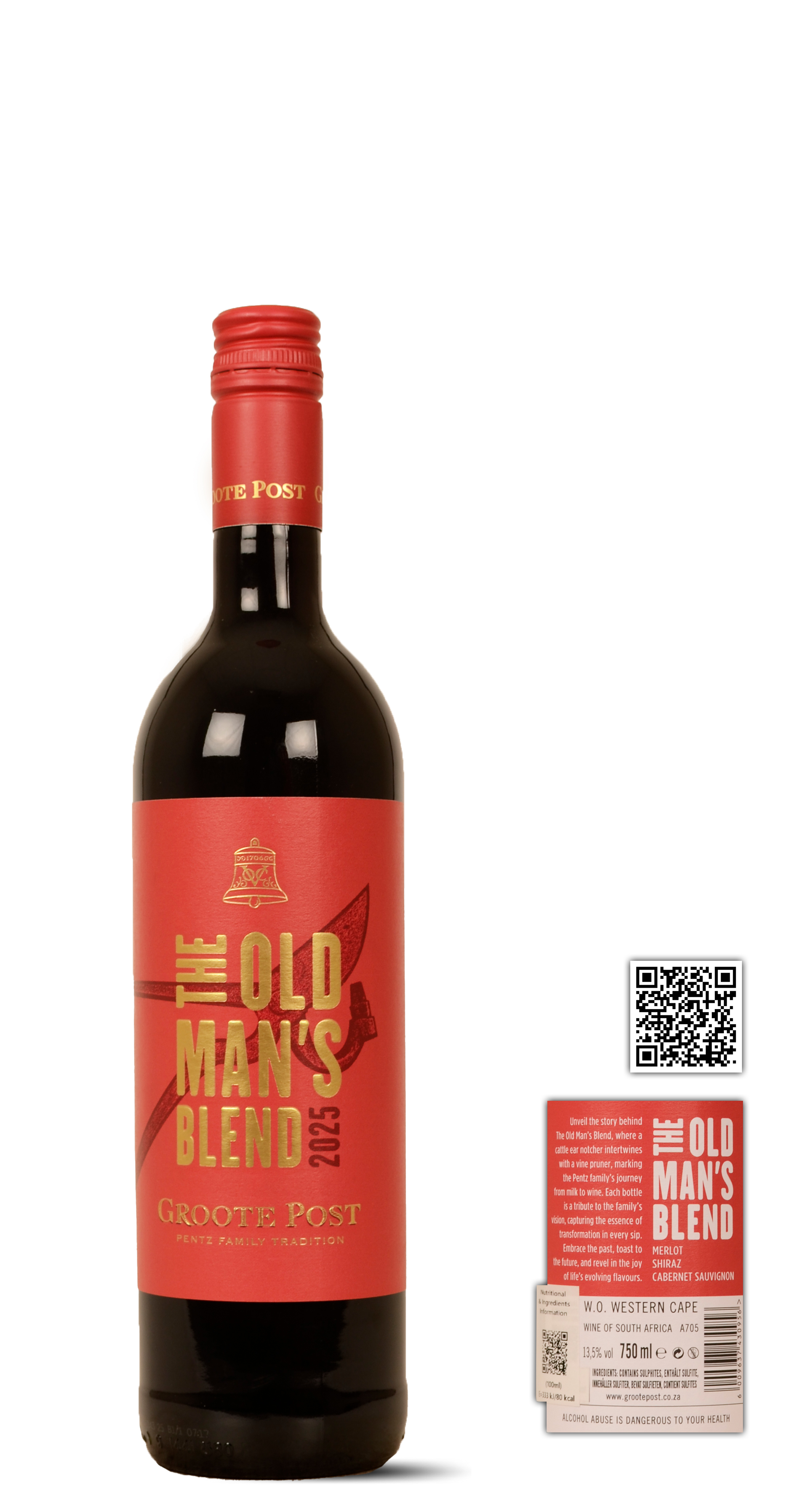 50% Merlot, 25% Cabernet Sauvignon, 25%. De 3 soorten worden apart gefermenteerde en gerijpt in een mix van 300L Franse eiken vaten en roestvrij staal. Na 10 maanden rijping wordt de definitieve blend gemaakt onder het waakzame oog van "The Old Man: Peter Pentz".